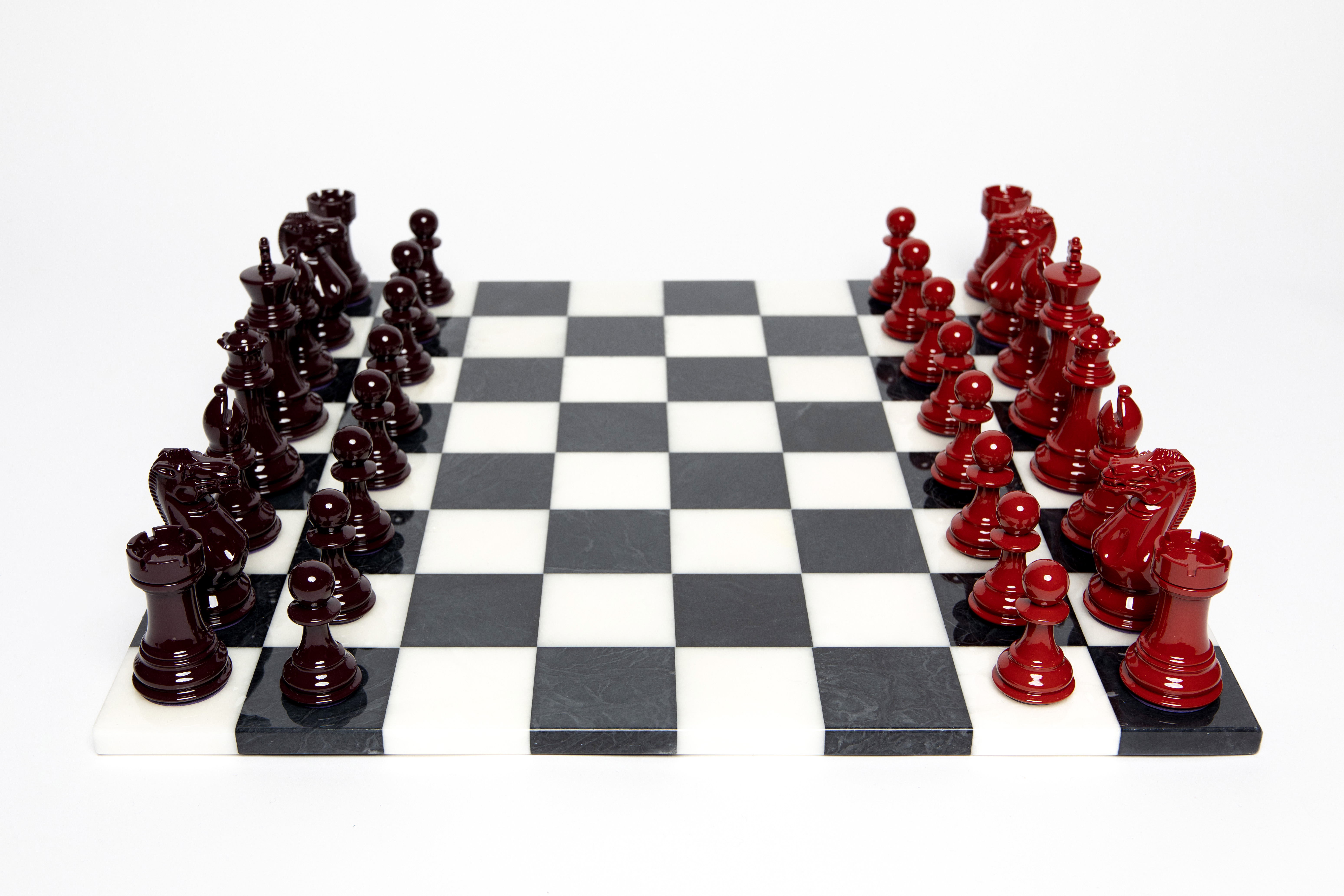 The chess pieces are hand carved in Boxwood, hand-painted and measure between3.5cm and 6.5cm and feature an Italian Nappa leather base felt, with the Purling logo embossed in 18 carat gold.